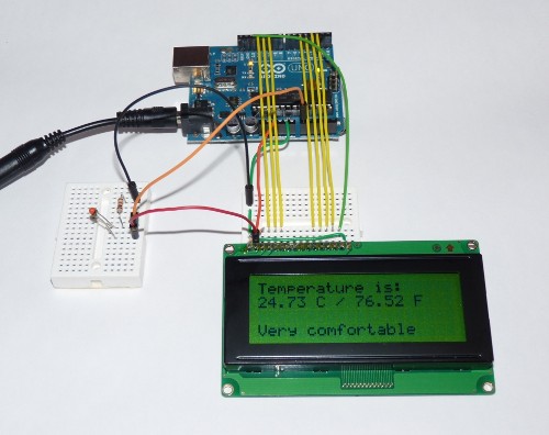 我们将使用LCD读取热敏电阻的温度。按照我们的Arduino LCD教程,使液晶显示器与您的Arduino一起工作。如果您不想使用LCD来获取温度读数,则可以随时更改草图以使用Arduino的串行连接到计算机,从串行监视器读取温度。
