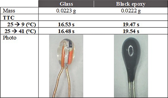 接下来,使用几乎相同质量的热敏电阻测试两种不同类型的封装,一种封装在玻璃中,另一种封装在黑色环氧树脂中。进行两次测试以指示冷却和加热,结束温度分别为9℃和41℃。结果如下表所示。