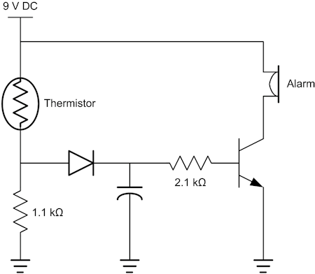 图4:使用热敏电阻检测温度的火警电路示意图。如果温度上升时电阻下降(负系数),则分压点向上移动。在大约1.4 V时,晶体管将打开,发出警报。TTC确定电路响应所需的时间。实际的实施可能需要一种在热量仍然存在时使警报静音的方法。