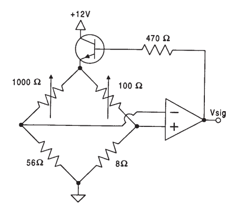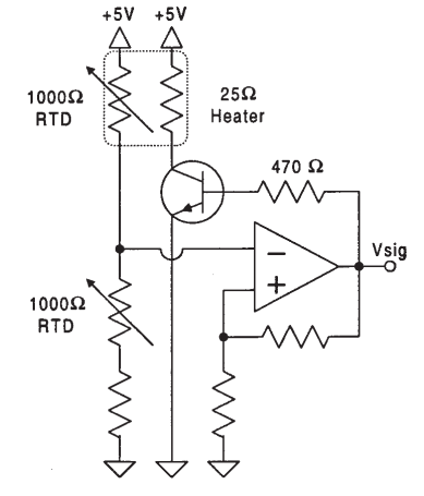 一种常见的自热浸没电路采用两个高压与桥接配置中的冰点值非常不同。当前的自热的小RTD, T J Tamb + DT,直到它同时发生电阻增加,rjr (环境温度+ A DT,平衡电桥。大RTD提供温度补偿。