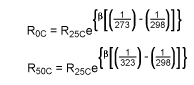 更多精确计算后,R3的最终值最终会略微修改,以匹配热敏电阻的β到所需的Ť Ç。为此,首先在0°C和+ 50°C下计算热敏电阻的电阻。NTC热敏电阻作为温度函数的标准公式如下: