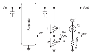 它基本上将电流i3添加到反馈节点中,使得i1 = i2 + i3。如果Vref是Vfb的两倍,那么i3在25C时为零,R1和R2按照稳压器数据表中的正常描述计算,温度依赖性可以通过简单地缩放R3来调整。另外,Vtemp可以由主机系统通过模拟 - 数字转换器获取。