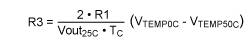 其中T C是Vout的负温度系数,单位为%/°C。(R3的这个值足以进行简化的设计计算,之后可以通过实验室的实验进行调整。)然后,为了避免在V TEMP和R3 之间需要缓冲放大器,请选择标称热敏电阻值: