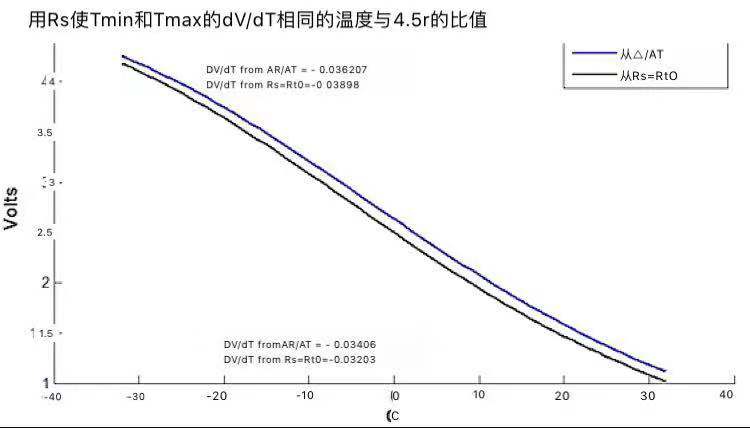 这些值代入公式3,值[R 小号,让我们最好线性化电阻是- [R 小号 = 26.459KΩ。另一种更简单的方法是选择R S = R TO,其中R TO是所需工作温度范围中间的热敏电阻。例如,T = 0°C时的R TO为29.49KΩ。这两种方法的结果如图5所示。对于温度操作的两个极限和dV / dT,明确规定了电压与温度的变化率在极端温度下,值非常接近相同的值。这意味着我们正在获得尽可能接近线性的电路响应。