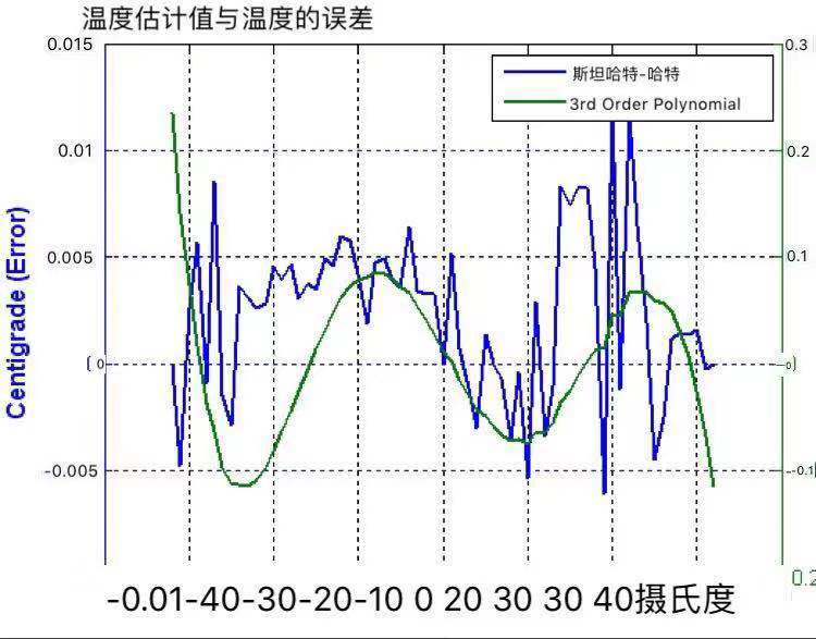 图7.使用Steinhart-Hart方程(蓝线)和三阶多项式(绿线)估计的温度误差