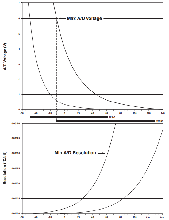 这意味着每比特的欧姆数减少了每个A / D步的度数增加。图4说明了这种关系。该图的上半部分显示了热敏电阻电阻和电压输入到A / D,和用于确定低温限制系统的。图的下半部分显示系统测量分辨率每个A / D转换器步骤的摄氏度,和用于确定温度上限限制。