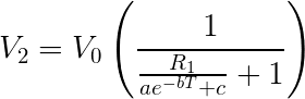如果我们假设一个温度范围,我们可以取温度范围的中间位置并将V 2置于中间,确保我们的R 1值完美地将温度范围的中间位于Arduino电压范围的中间。一旦从所需的温度范围计算出电阻,我们就可以使用以下公式来预测Arduino电压与温度的关系: