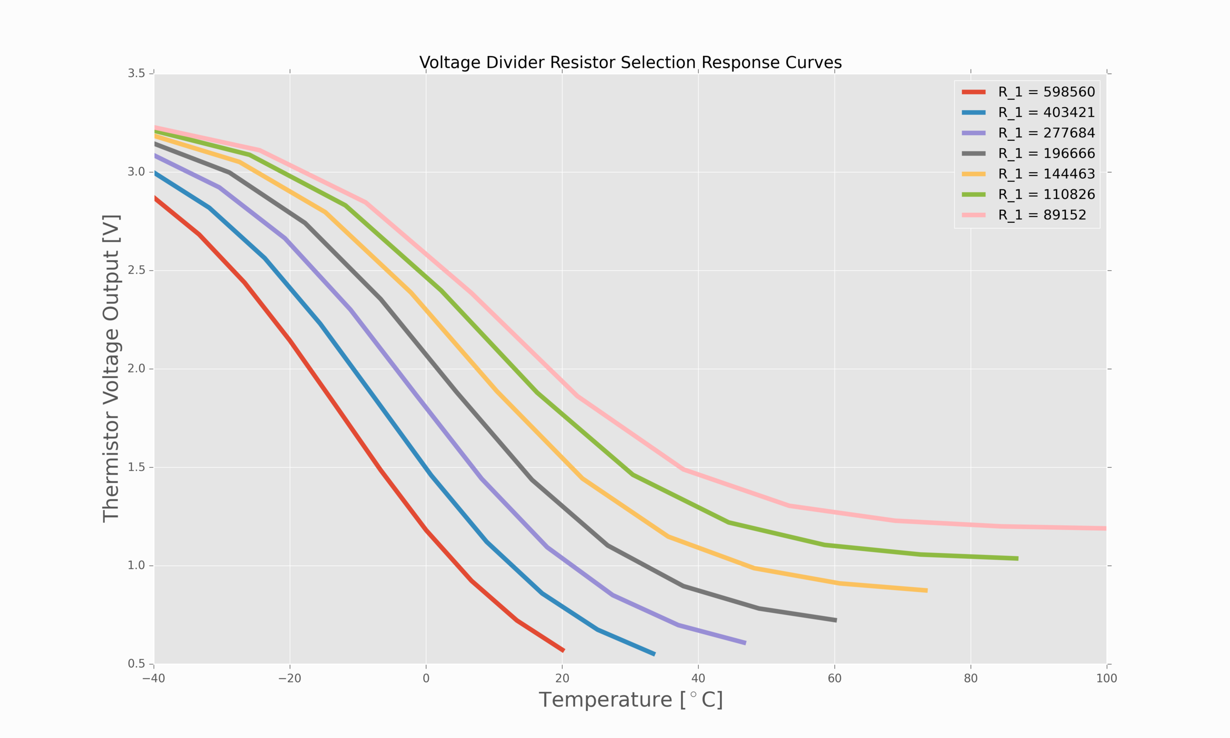 分压器电阻响应曲线。热敏电阻电压的响应根据所选的分压电阻而变化。请务必在上面的电阻器附近选择一个电阻器,以满足您所需的特定温度范围。